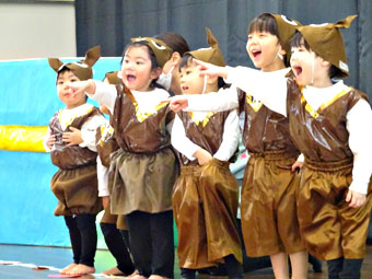 おうちの方の前での発表はちょっぴりドキドキ!でも、いつも一緒に遊んでいるお友だちや先生が一緒なので安心して楽しく、みんなが主役となり発表することができました。