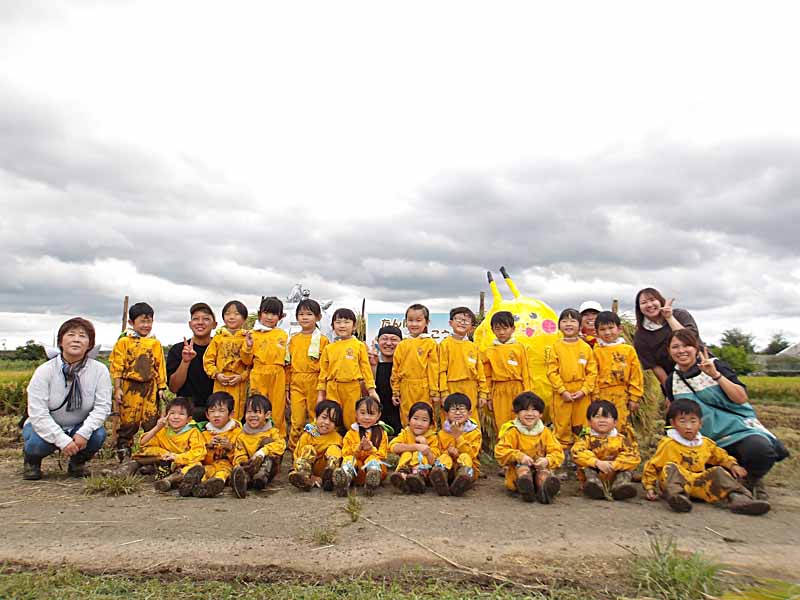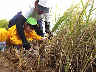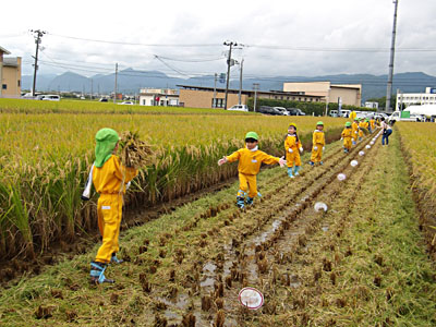 5歳児のお友だちが一生懸命植えた稲がすくすく育ち、いよいよ稲刈りです! 地域の農業者の方々にご指導いただき、一人ずつ鎌で稲刈り体験しました。 「けっこう難しいな~」「チクチクする」と手作業の大変さを経験した子ども達。刈った稲穂はバケツリレー形式で稲杭まで大切に運びます。一人では大変なこともみんなでやるとあっという間!連日の雨でぬかるんだ田んぼの中で、足を取られて泥んこになりながらも一生懸命頑張りました。 5歳児以外の年次のお友だちも、稲刈りを見学し、それぞれに貴重な体験ができた一日となりました。 5歳児のお友だちは汗だく、泥だらけになり「お米を作るのって大変だね」とその有り難さを感じるとともに「ボクたちのお米を食べるの楽しみだな~」と期待に胸を膨らませていました。  |