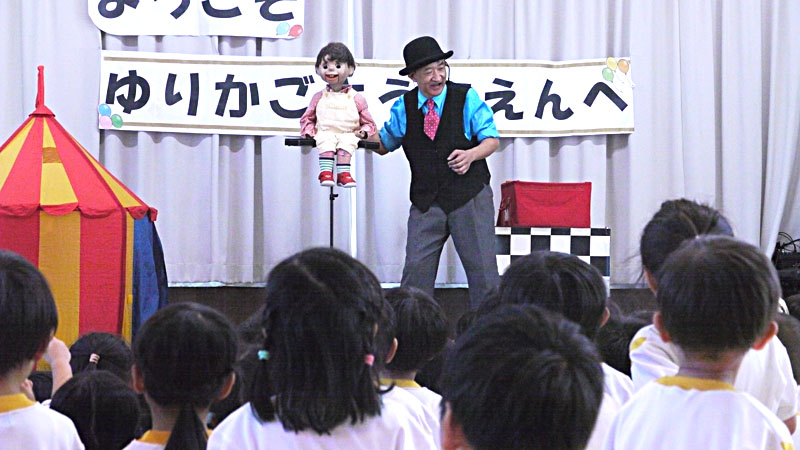 ゲストに「Mr.チョップリン」さんをお迎えし、様々なマジック、腹話術などわくわく・ドキドキするようなパフォーマンスを披露していただきました。 次々に繰り広げられるパフォーマンスに子ども達の目は釘付け!身を乗り出してパフォーマンスを見たり、大きな拍手を送ったり、大興奮の子ども達でした! 保育室へ戻る際、5歳児のお友だちは、「フラフープのマジックすごかった!」「腹話術がおもしろかった!」など、チョップリンさんに感想を述べながらハイタッチを交わす姿があり、とても楽しい時間となったことが伺えました。 「チョップリンさん(そしてだいちゃん)」、また幼稚園にきてくれるといいですね! |