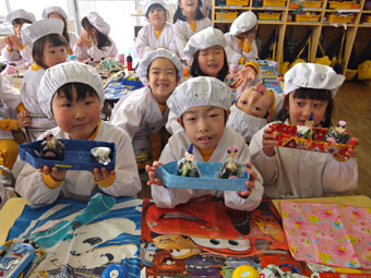 今年度最後のお楽しみ会「ひなまつりパーティー」 それぞれに持ち寄ったお野菜を使っての豚汁と、お雛様とお内裏様のおにぎり作りに挑戦しました。 お手伝いのお母さん方に作って頂いたデザートの桃ゼリーも美味しく頂き、女の子の節句をお祝いしました。 自分達で作ったお料理の味は最高! |