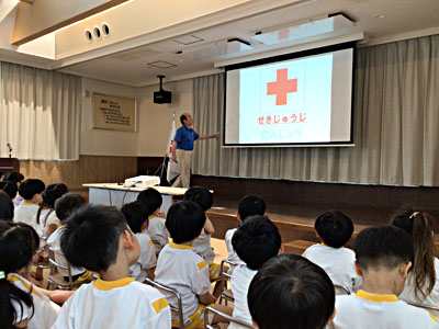 講師に石川宙二先生をお招きして、JRC加盟登録式を行いました。また、5歳児の代表のお友だちがバッチを受け取り、活動への心構えをもって気持ちを新たにしたようでした。 この活動で大事にしたいこととして、「いのちを大切にすること」「やさしい行動を心掛けること」「みんなとなかよくすること」の「JRCのこころ」についてお話をお聞きし、これからの生活の中でも意識しながら過ごしていきたいと思っています。 |